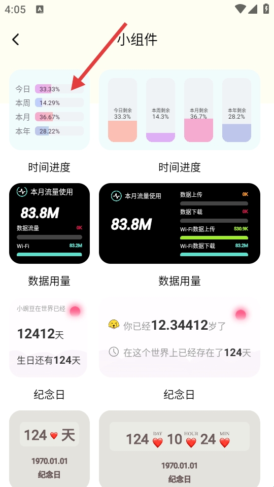 2、进入小组件页面后,选择如【时间进度】类的小组件。