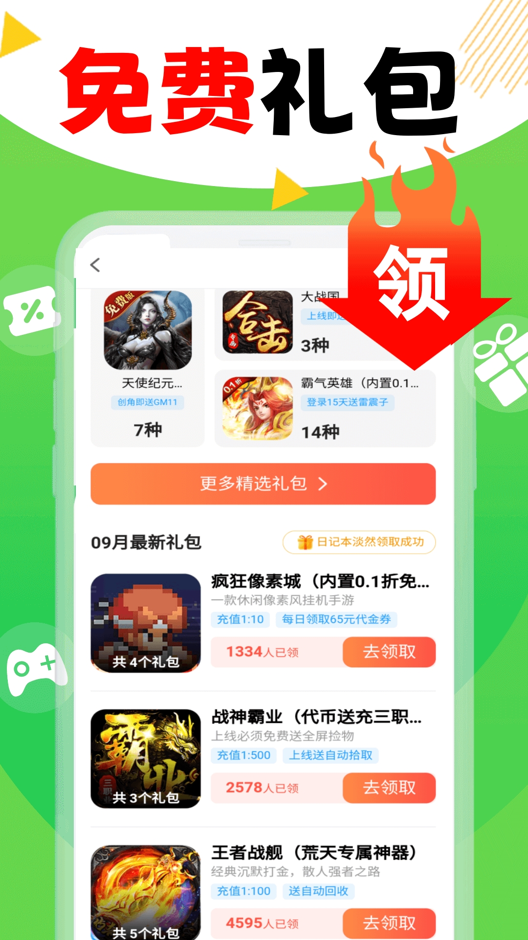 折爆游戏福利助手是一款功能十分全面的游戏福利领取软件,在该软件里面具有多款手游的福利以及大礼包玩家只需要进行简单的点击就可以进行领取,而且还提供了充值点卷的抵扣劵,为玩家省下一笔不少的钱,还在等什么呢,大家一起来下载吧!