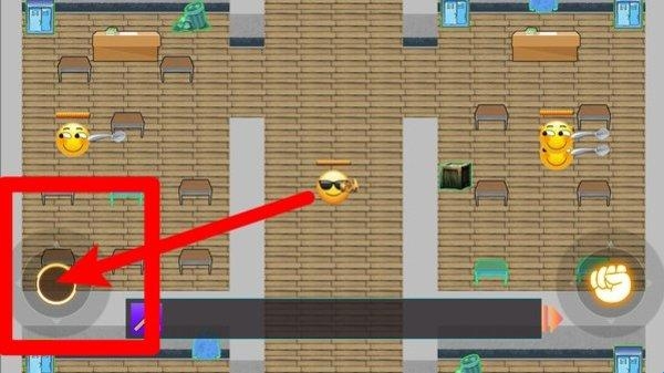 3.左下角的虚拟摇杆为角色移动控制,玩家通过滑动可操纵方向与走位,在校园环境中自由探索并规避敌人。