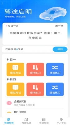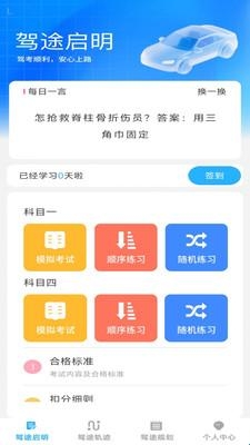 1、驾途启明页面,带来了签到、模拟考试、知识查询等功能,都是免费浏览。