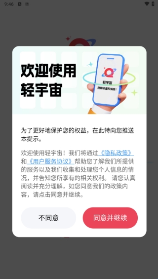 1、打开软件来到欢迎页面,阅读用户协议和隐私协议,点击同意即可开始使用。