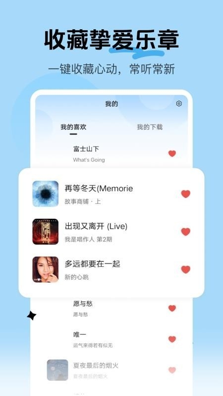 4、我的喜欢:可将你喜欢的各种歌曲添加喜欢收藏,可随时到我的喜欢功能中查找你收藏的歌曲。