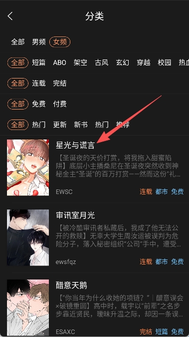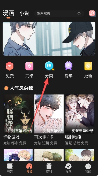 3、在书城页面点击“分类”,可按题材等筛选内容。
