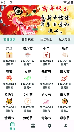 祝福语大全是一款功能十分全面的祝福文案软件,在该软件里面具有海量的各种节日的祝福话语还提供海量的短信以及贺卡,方便您在逢年过节的时候为家人以及朋友送上真诚的祝福同时还可以帮助您关注自身的健康记录美好瞬间哦,大家一起来下载吧!