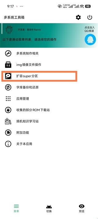 1、打开多系统工具箱App,点击菜单选择【扩容super分区】