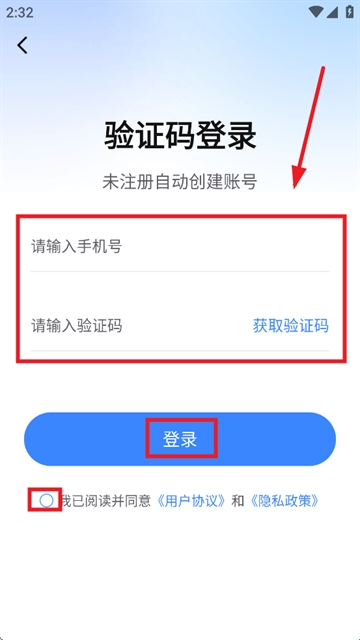 4、在登录界面输入手机号,验证码,勾选我已阅读并同意 《用户协议》 和 《隐私政策》,点击登录即可,未注册自动创建账号