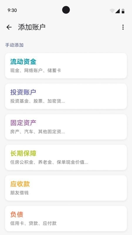 6、添加账户:根据需要就可以实时添加账户,手动添加需要的资产账户,一键添加账户。