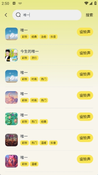 2、在搜索页面中输入关键词即可找到你喜欢的铃声,然后进行设铃声即可;