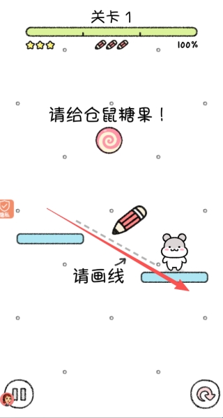 1、进入游戏后,通过画线的方式引导仓鼠吃掉上方的糖果,完成关卡任务。