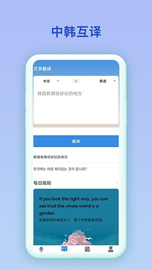 中韩互译翻译app,专注韩文中文翻译的专业外文翻译软件,准备去韩国旅行、留学或者工作的朋友可以使用这款软件翻译韩文,与韩国人交流。软件支持语音翻译,当面对韩国人时,我们可以借助它来实现同声传译,快速翻译对方的语言,降低翻译的时间成本,提高效率。