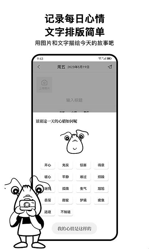 2、进行日记标题、心情打分、内容添加,记录每日日记