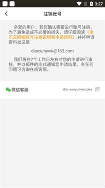 3、进入后会有一个再次确认注意事项,将自己的账号信息发送至该微信客服后等到注销即可。