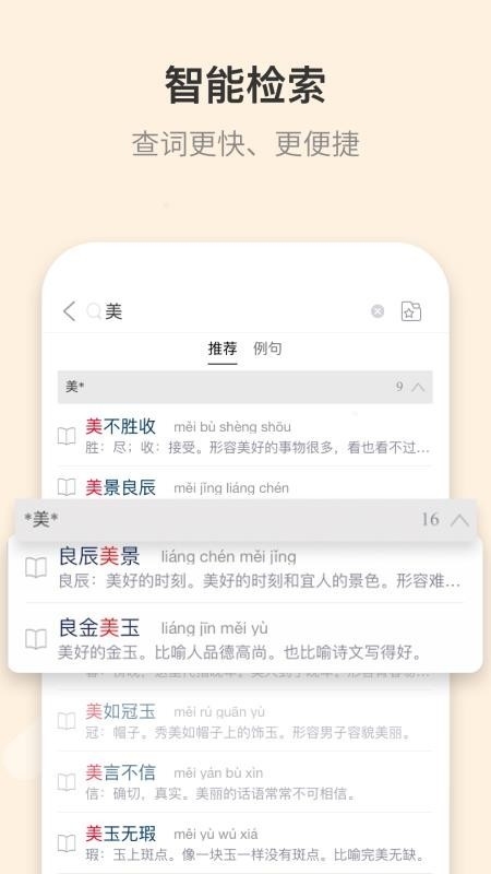 - 《成语大词典》APP在纸书基础上额外融入《小学生成语词典》,内容更全。软件收录成语18,000余条,支持模糊查询、查例句、查近反义、查关联词等多种智能检索方式,又快又准,满足你的查词需求。学语文、练写作都用《成语大词典》APP,走进成语世界,从此妙笔生花。
