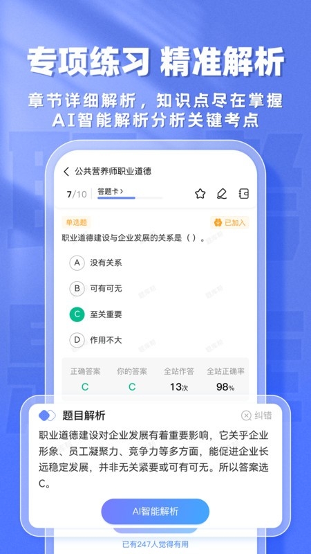 1、数据驱动精准分析,记录刷题情况,反馈错题种类和频率,帮助快速定位薄弱环节,精准提分。