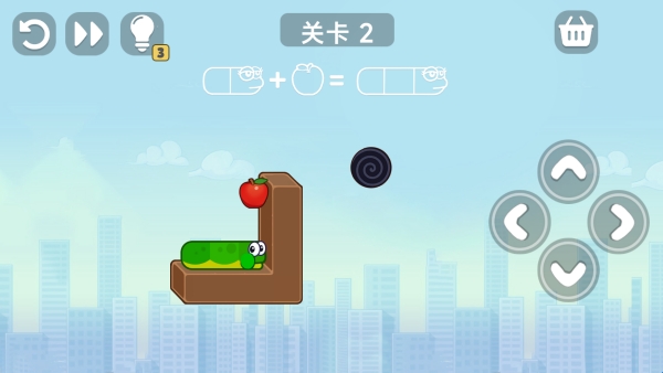 1、通过方向键或触屏滑动控制小蛇移动方向,在迷宫关卡中引导小蛇吃掉所有苹果。