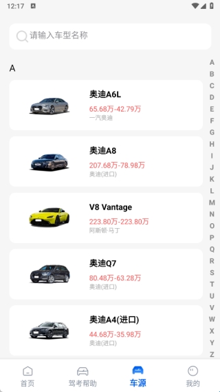 4、在车源页面中可以知晓不同的品牌,而且可以输入车型名称进行了解。