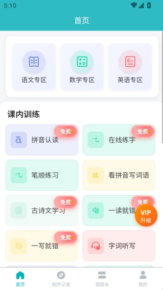 4、进入到首页,这里有语数外专区,还有课内训练等内容。