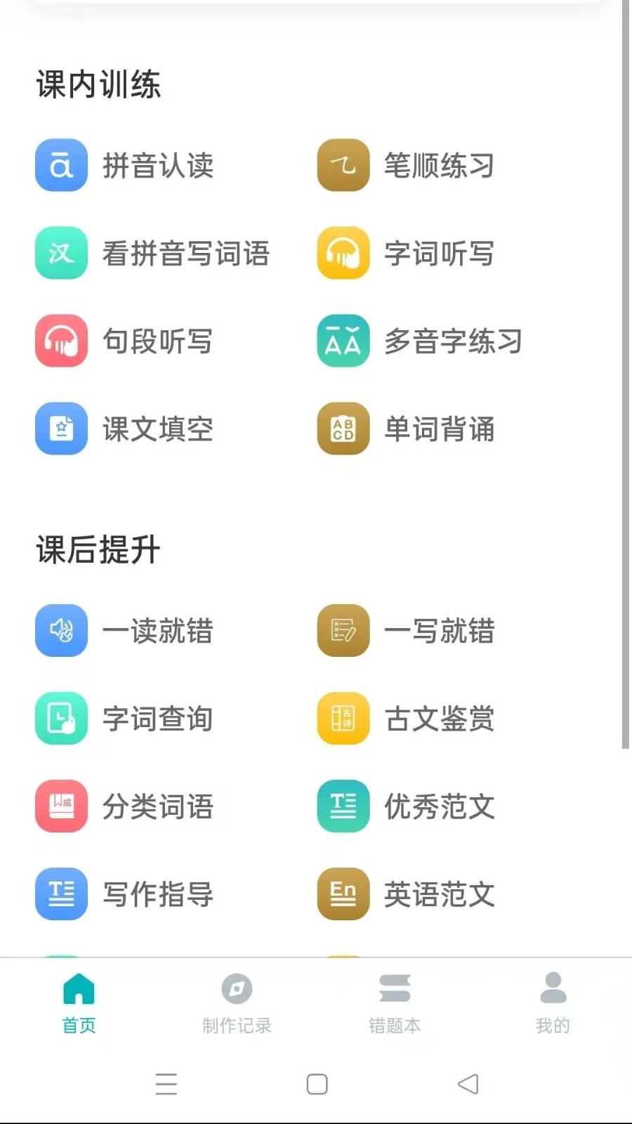 2、配备识字、听写、练字、口算、单词、听力、口语、错题本、刷题等18款智能教辅专项工具。