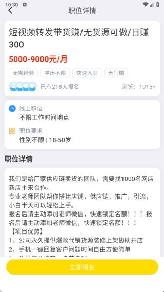 2、在职位详情页面中可以了解最新的岗位动态信息,用户可以点击立即报名进行投递;