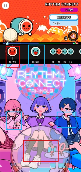 5、玩法就和街机一样,红色的敲击中间,蓝色的敲击两边,大鼓则需要两只手同时敲击。