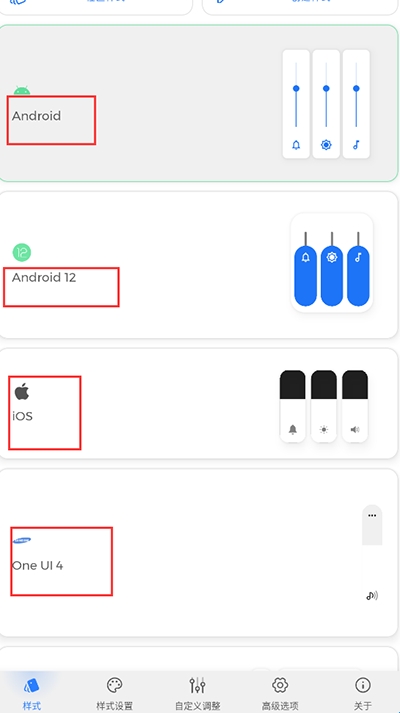1、安装完成打开后,选择最下面的样式设置,可以看到各式各样系统的音量调整画面