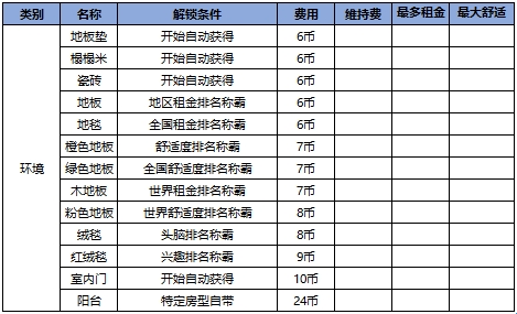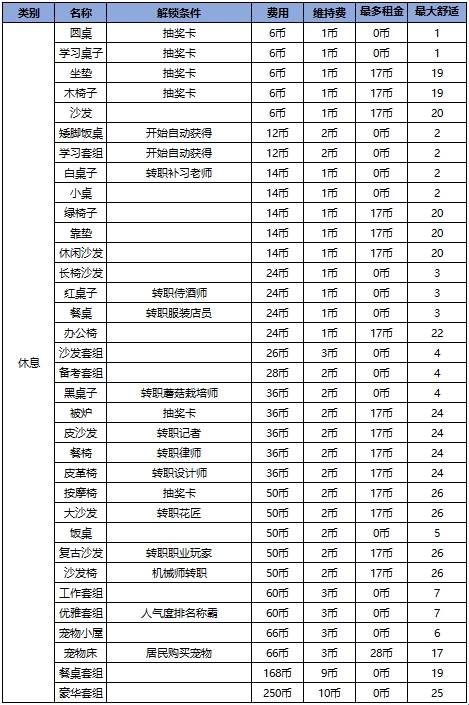 所有家具的解锁条件、建造成本以及效益
