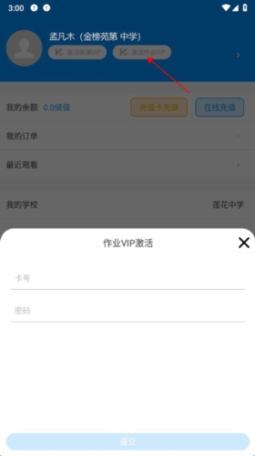 1、打开并登录新教育学生端app,进入【我的】页面点击页面顶部的【激活作业VIP】(下图红色箭头所指区域),在底部弹出的对话框中输入老师给的卡号和密码