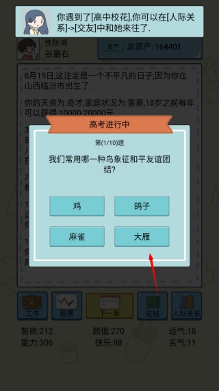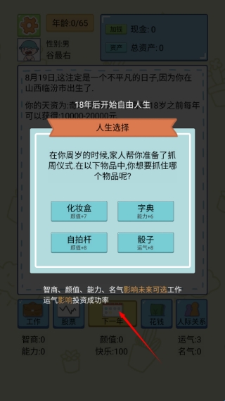 2、在游戏中合理控制“摆烂”程度,不要过度沉迷,18年后正式开启自由人生阶段,面对各种事件时根据自己的需求选择,优先增加关键属性。