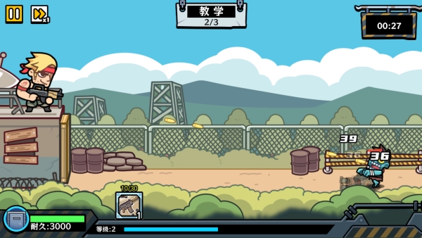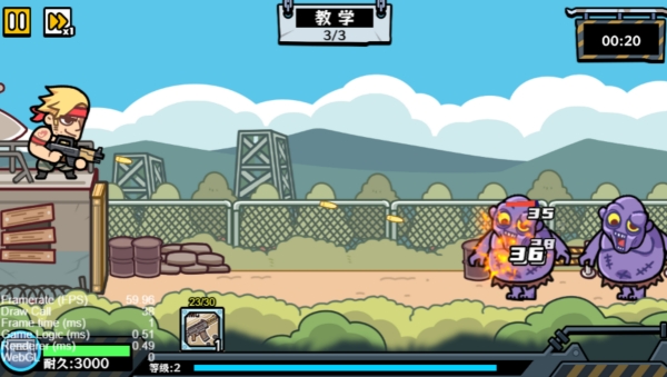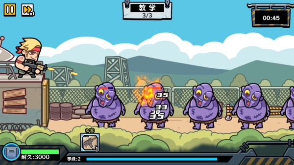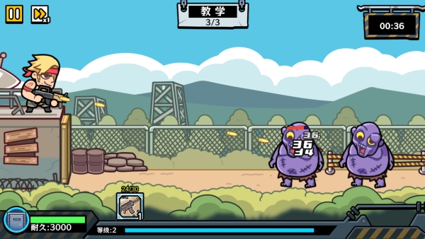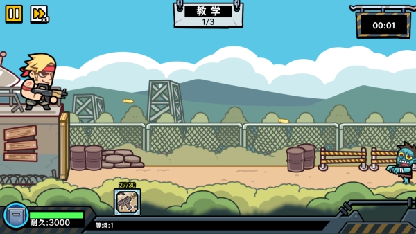 1、进入教学关卡,从等级1开始,操控角色拿着枪支前行,击杀前方的僵尸。