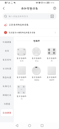 5、开启位置服务和蓝牙连接,选择左边下拉框的运动健康,进入选择体脂秤型号