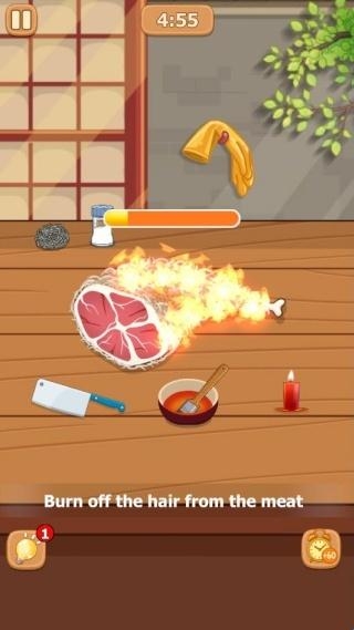 2、在烹饪过程中,玩家需要准备食材,例如将火腿去毛并烤熟。玩家要灵活翻转食材,确保每个面都烤至金黄,然后洒上调料。