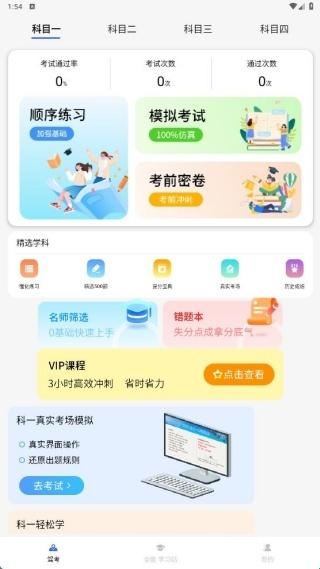 1、安装进入驾考页面,可以看到科一到科四的训练题目,轻松作答。