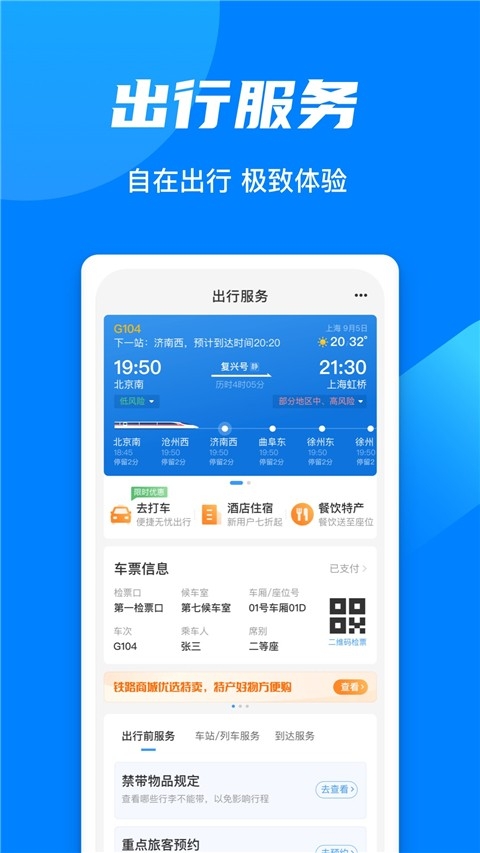 1、随时随地购买火车票、退票,火车票数据来源12306官方平台,数据同步快速,及时、准确。