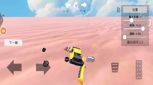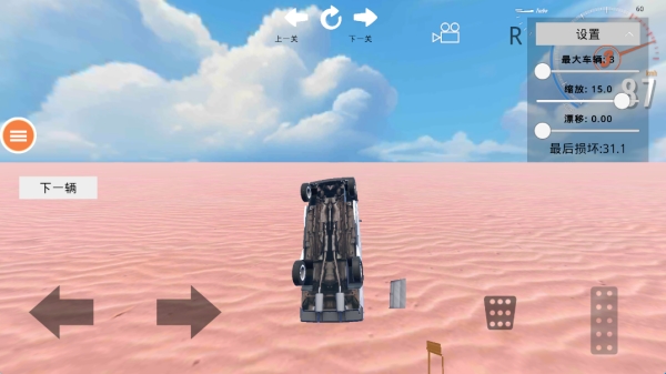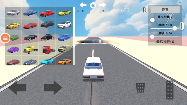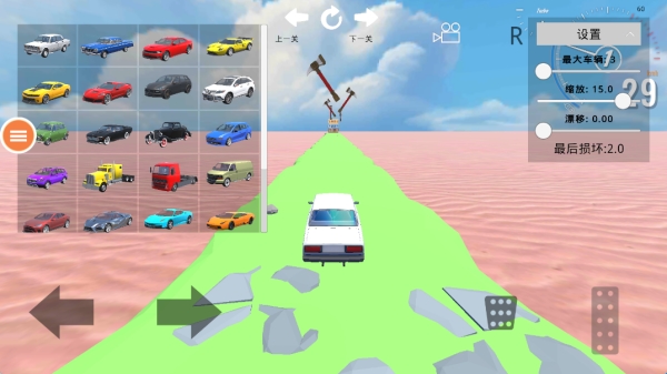 1、玩家可以闯关之前自由选择车辆,驾驶车辆穿越不同类型的道路,汽车会撞击各种物体。