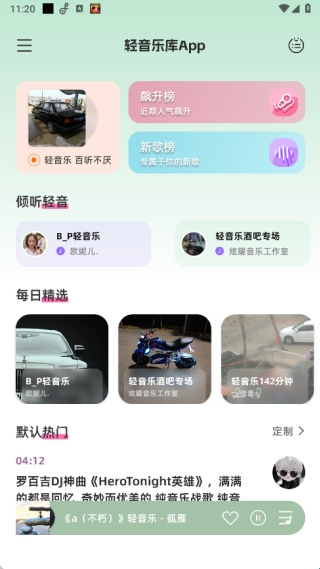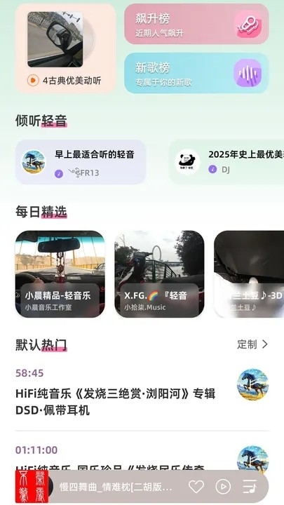 1、打开软件有各类好听的音乐,还有飙升榜、新歌榜、倾听轻音、每日精选和默认热门等版块;