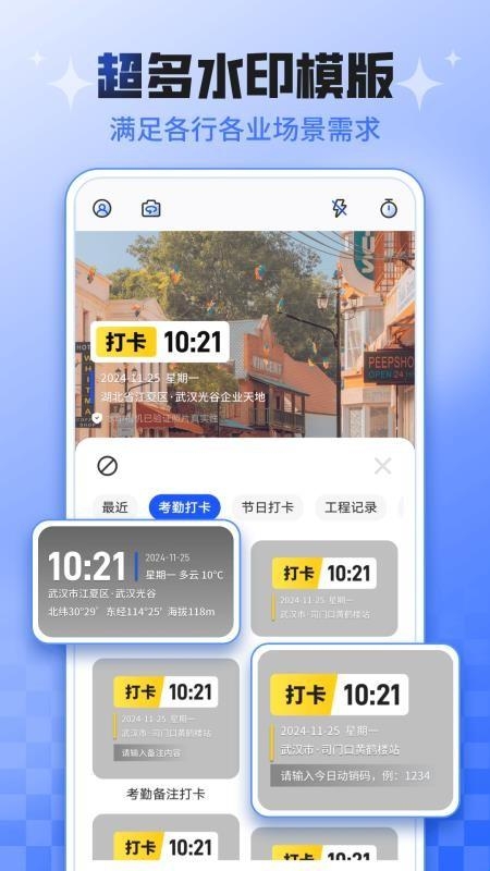 2、覆盖全场景:海量水印模版资源覆盖了各行各业全场景的水印打卡需求,让大家打卡记录信息更方便。