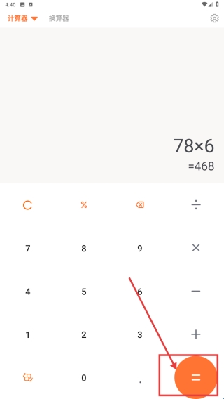 3、点击=等号 ,计算器自动计算78×6,得出结果468。