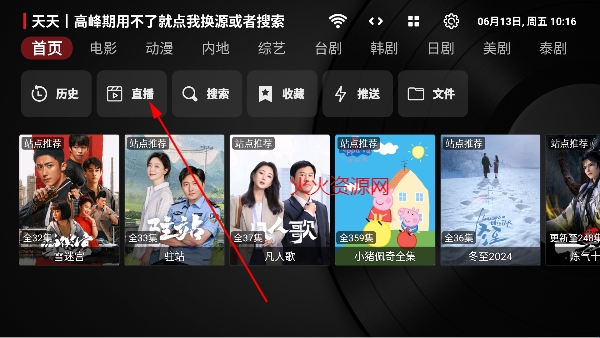 1、打开应用后,在首页点击顶部的 “直播” 按钮,进入电视直播界面。