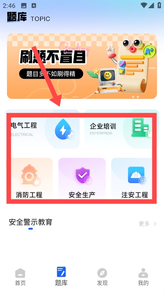 2、在题库页,选红色框内的目标分类,进入对应题库。