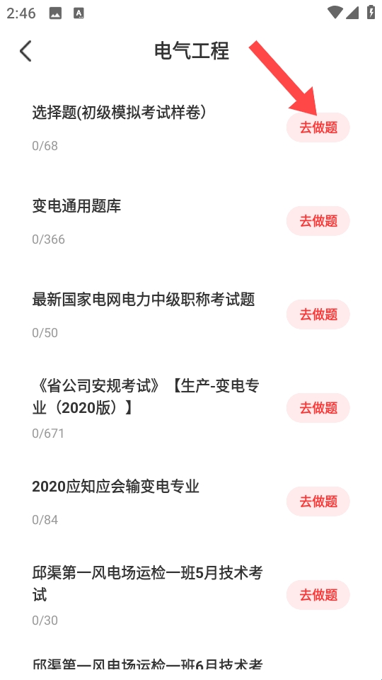 3、进入【电气工程】题库,点题目右侧【去做题】,开始答题练习。