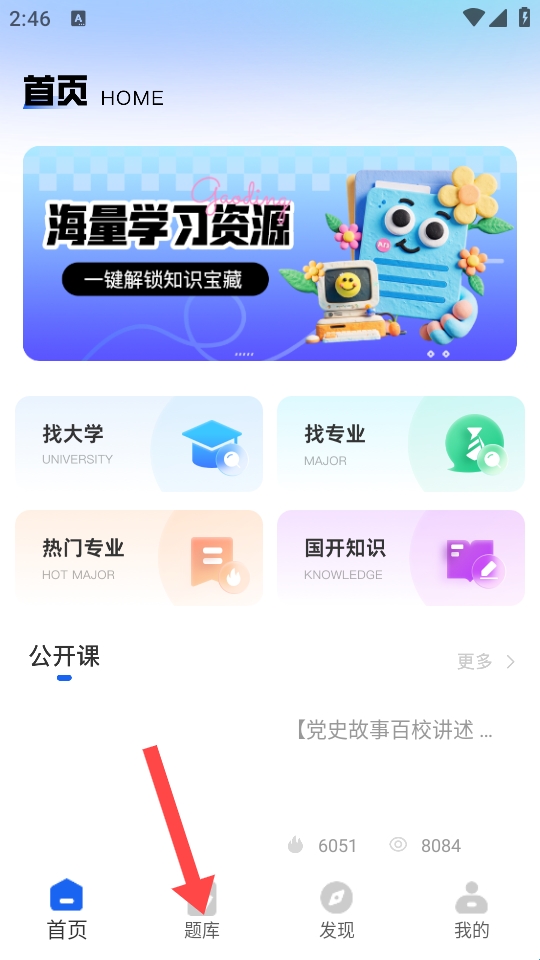 1、点底部【题库】,从首页切换至题库页面,浏览学习资源分类。