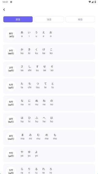 2、进入50音学习板块,可以浏览到清音、浊音等内容。
