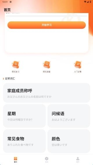 1、安装app进入,首页展示了50音学习和日常词汇板块,免费查看。