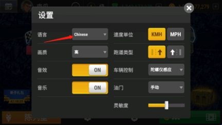 然后点击语言那一栏即可,还可以设置速度单位,跑道类型,车辆控制等,大家可以依据自身喜好来进行设置。
