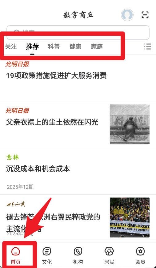 2、首页为推荐资讯,还可按关注、科普、健康和家庭等分类浏览,轻松获取内容。