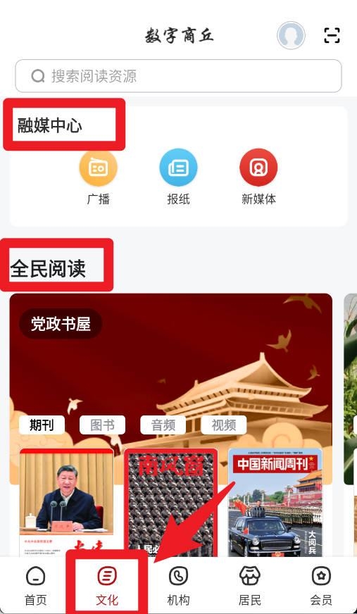 3、文化栏目提供融媒中心和全民阅读入口,支持浏览广播、报纸和新媒体等资源。