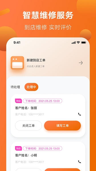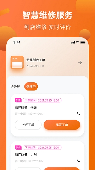 提交维修工单:首页点击“新建工单”,选择上门到店服务,填写故障描述与预约时间,提交后系统自动接收。