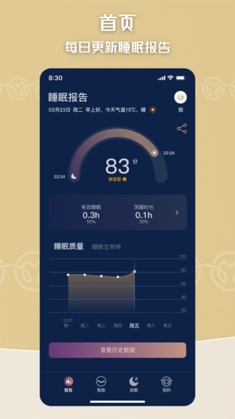 4、查看自己的睡眠记录和分析的报告,了解到自己的睡眠质量去进一步的改善。