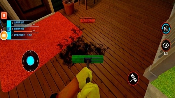 4、地面有一大片污渍,点击右上角的工具栏,然后选择拖把,将地上的污渍清扫干净。
