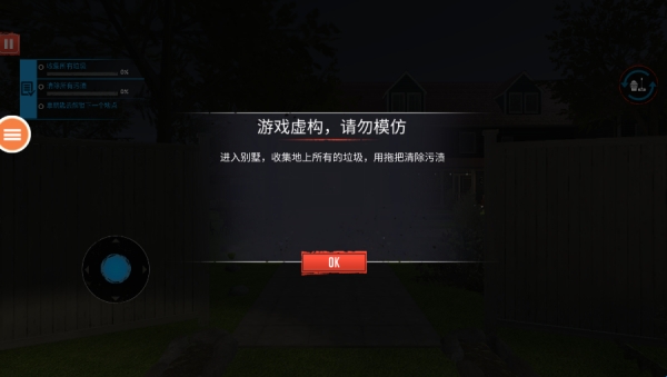 2、进入游戏,此关的任务是进入别墅,收集别墅周围的垃圾,将别墅清理干净。